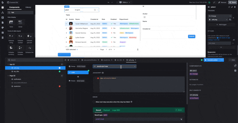 Sorry spherebread…I stopped getting notifications of responses to this forum post. here is a vimeo video of what i mean. In the ui bakery documentation it says i can use app.setLocale(); to change the locale programatically (in my case so that the date pickers and date column types in the table component show the right language and format for dates. I made a vimeo video of what exactly I mean, but I can’t post it in this forum so not sure how to provide that.