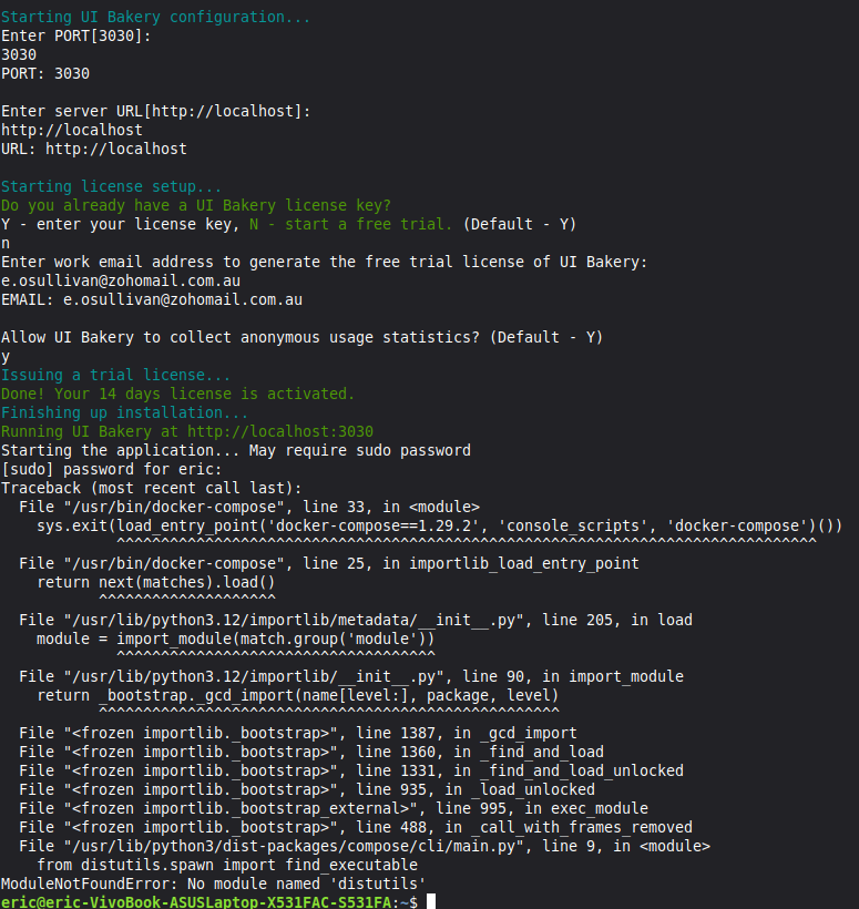 Thanks for your patience once again. I had trouble installing UI Bakery because there were some issues with Docker and Docker compose. I have Linux Mint 22, and I was having extreme difficulty in installing them through the terminal, so I installed them via Software Manager. The result is the following screenshot: