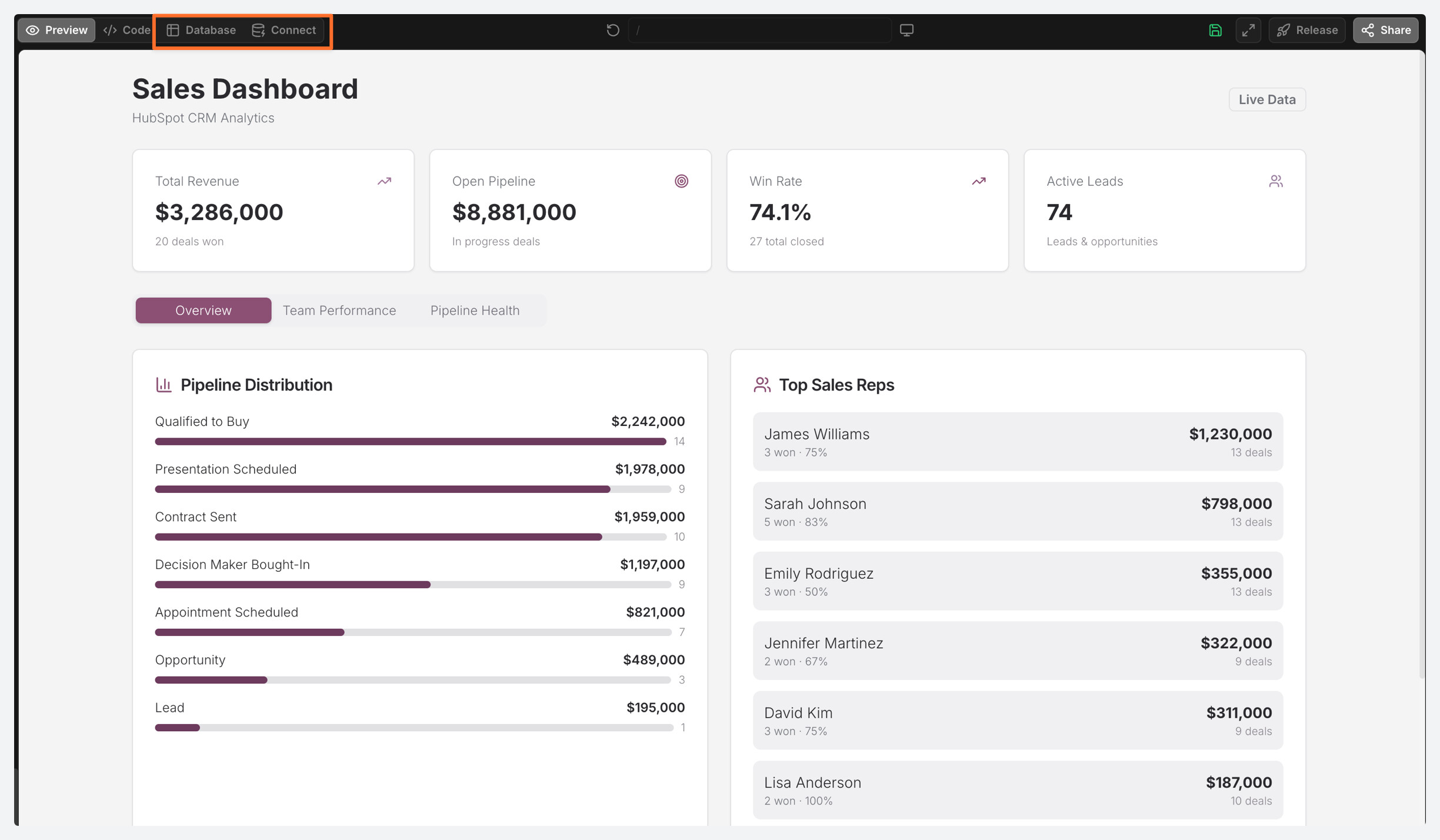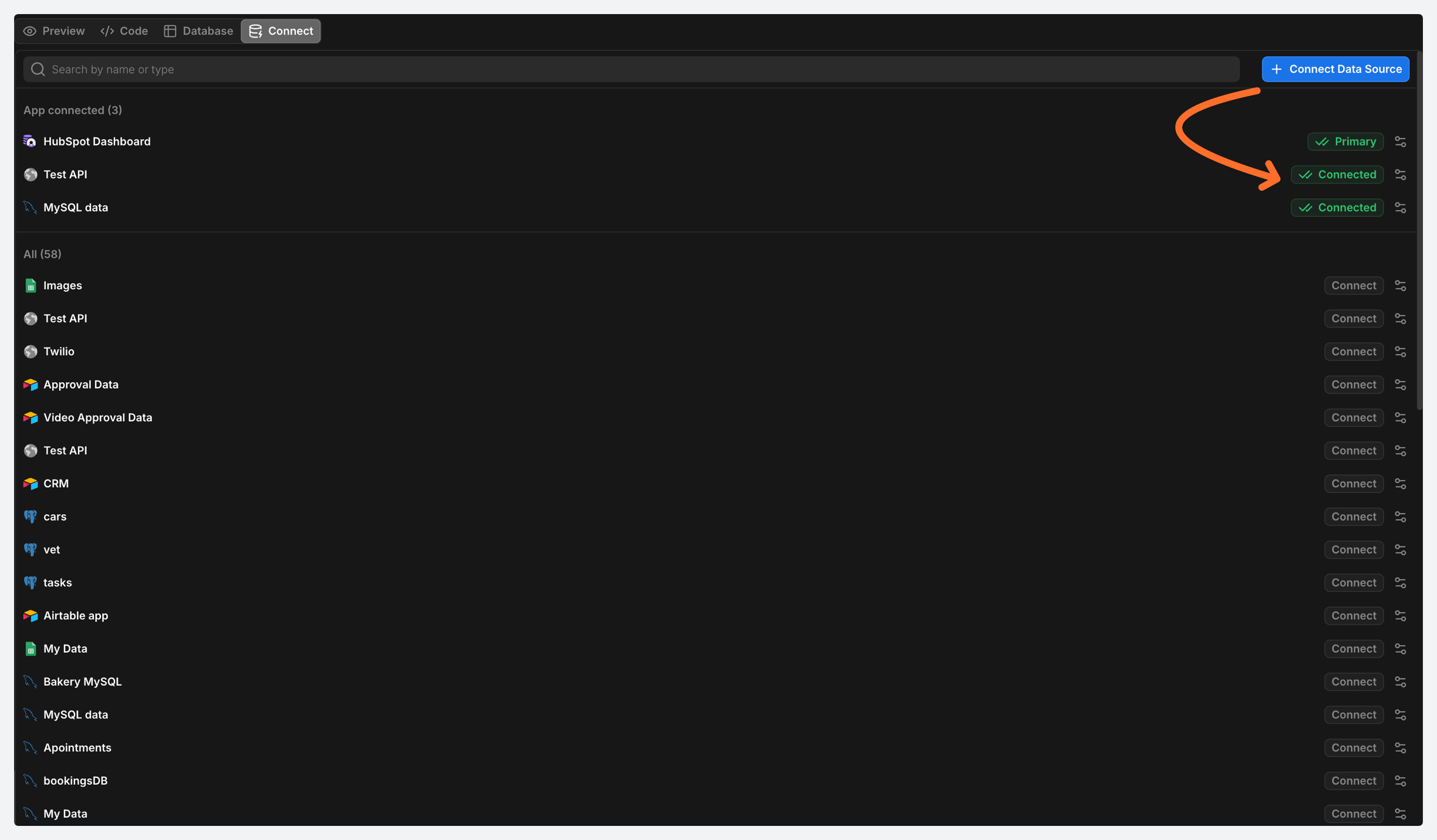 Moved “Database” and “Connect” from the sidebar to the header in the AI Builder for quicker access alongside Preview and Code.