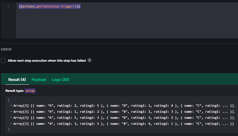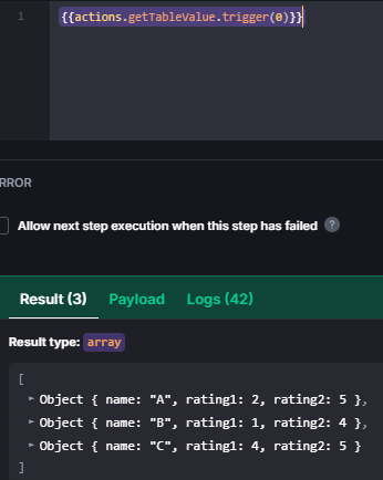 Now you can call the action as actions.getTableValues.trigger(n), where n is either a number between 0 and amount of ListView items - 1, or any falsey value (null, undefined, etc. so just don’t pass anything). That way you can get either the values of a specific item or all items: